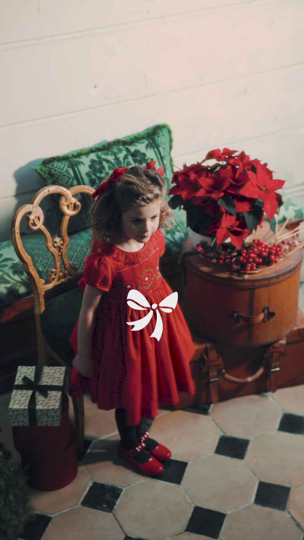 Young girl in Sofia Red Smocked Dress standing in a room with decorative items.
